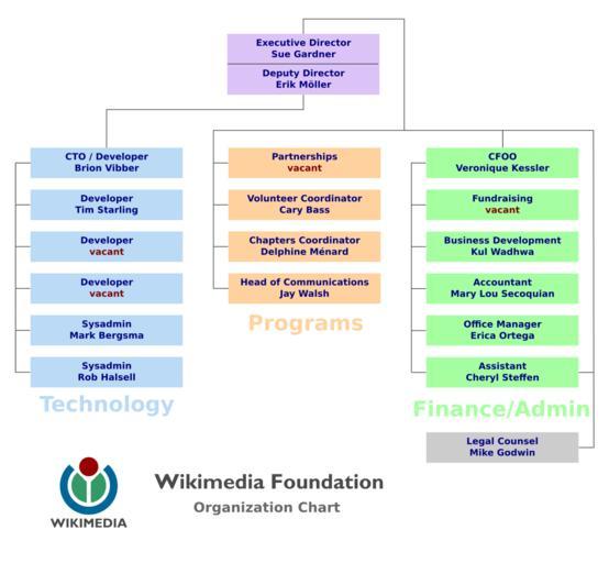 | Keywords: Wikimedia Foundation organization chart.svg en An organization chart for the Wikimedia Foundation as of 11 January 2008 Lighter frames indicate employees in St Petersburg who will not relocate to San Francisco Warning This file is outdated and kept for historical value only Editable SVG format created by User Guillom from a public domain PDF uploaded by user Eloquence both originally on the Wikimedia Foundation wiki 2008-01-11 Users Eloquence and Guillom foundation Wikimedia Foundation wiki Eloquence Cc-by-sa-3 0 Wikimedia trademark Wikimedia organizational charts |