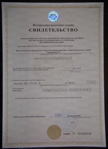| Keywords: WikimediaRU-SvidetelstvoOPostanovkeNaUchyotVNalOrgane.jpg Феде альная алоговая Служба Фо ма N-1-1-Учет Свидетельство о постановке на учет оссийской о ганизации в налоговом о гане по месту нахождения на те ито ии РФ екомме ческое па тне ство содействия асп ост анению энциклопедических знаний «Викимедиа РУ» Federal Tax Service Certificate of recording a Russian organizagion in tax authority in place of residence Non-Commercial Partnership of promotion of distribution of Encyclopedic Knowledge Wikimedia RU This is an official document and therefore it is not protected by the Russian Copyright Laws Therefore it is in Public Domain in sense as it treated in Wikimedia meta wikimedia Jusjih 2008-12-02 Original uploader was Drbug at http //meta wikimedia org meta wikimedia PD-RU-exempt original upload log page meta wikimedia WikimediaRU-SvidetelstvoOPostanovkeNaUchyotVNalOrgane jpg 2008-12-02 17 29 Drbug 2296×3176× 2475508 bytes <nowiki>Феде альная алоговая Служба Фо ма N-1-1-Учет Свидетельство о постановке на учет оссийской о ганизации в налоговом о гане по месту нахожд</nowiki> Wikimedia Russia docs |