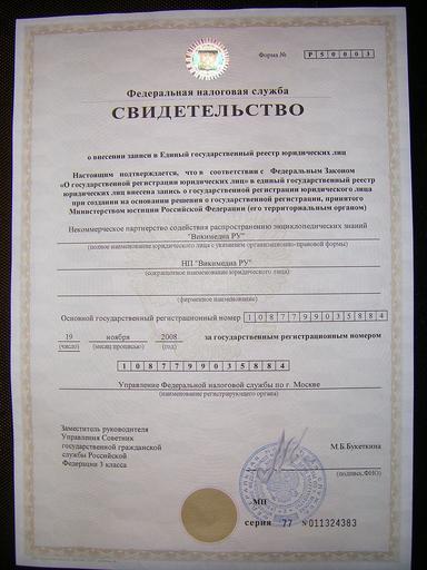 | Keywords: WikimediaRU-SvidetelstvoOVneseniivEGRYuL.JPG Феде альная алоговая Служба Фо ма Р50003 Свидетельство о внесении записи в Единый госуда ственный еест ю идиеских лиц екомме ческое па тне ство содействия асп ост анению энциклопедических знаний «Викимедиа РУ» Federal Tax Service Certificate of making record in Unified State Registry of Legal Persons Non-Commercial Partnership of promotion of distribution of Encyclopedic Knowledge Wikimedia RU This is an official document and therefore it is not protected by the Russian Copyright Laws Therefore it is Public Domain in sense as it treated in Wikimedia meta wikimedia Jusjih 2008-11-27 Original uploader was Drbug at http //meta wikimedia org meta wikimedia PD-RU-exempt original upload log page meta wikimedia WikimediaRU-SvidetelstvoOVneseniivEGRYuL JPG 2008-11-27 10 45 Drbug 2448×3264× 1376462 bytes <nowiki>Феде альная алоговая Служба Фо ма Р50003 Свидетельство о внесении записи в Единый госуда ственный еест ю идиеских лиц екомме ческое �</nowiki> Wikimedia Russia docs |