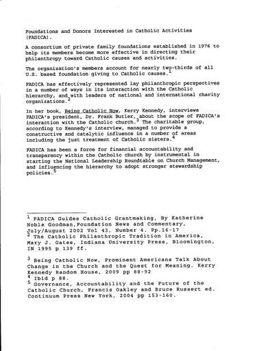 | Keywords: Wikipedia Article on FADICA 001.jpg en An article on the principal philanthropic organization for private foundations assisting Catholic actitivities From FADICA Francis J Butler 10/06/2010 Foundations and Donors Interested in Catholic Activities FADICA A consortium of private family foundations established in 1976 to help its members become more effective in directing their philanthropy toward Catholic causes and activities The organization ™s members account for nearly two-thirds of all U S based foundation giving to Catholic causes FADICA has effectively represented lay philanthropic perspectives in a number of ways in its interaction with the Catholic hierarchy and with leaders of national and international charity organizations In her book Being Catholic Now Kerry Kennedy interviews FADICA ™s president Dr Frank Butler about the scope of FADICA ™s interaction with the Catholic church The charitable group according to Kennedy ™s interview managed to provide a constructive and catalytic influence in a number of areas including the just treatment of Catholic sisters FADICA has been a force for financial accountability and transparency within the Catholic church by being instrumental in starting the National Leadership Roundtable on Church Management and influencing the hierarchy to adopt stronger stewardship policies FADICA Guides Catholic Grantmaking By Katherine Noble Goodman Foundation News and Commentary July/August 2002 Vol 43 Number 4 Pp 16-17 The Catholic Philanthropic Tradition in America Mary J Oates Indiana University Press Bloomington IN 1995 p 139 ff Being Catholic Now Prominent Americans Talk About Change in the Church and the Quest for Meaning Kerry Kennedy Random House 2009 pp 88-92 Ibid p 88 Governance Accountability and the Future of the Catholic Church Francis Oakley and Bruce Russert ed Continuum Press New York 2004 pp 153-160 Text pages |