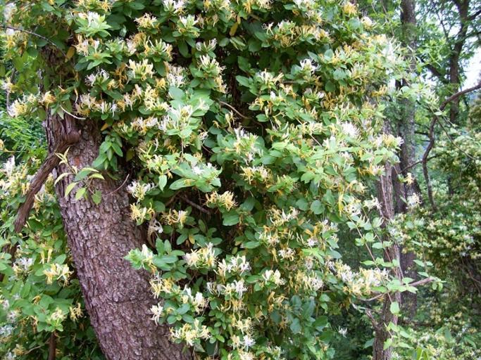 Keywords: Wild Honeysuckle1.jpg en Wild honeysuckle growing in trees 2011-08-23 own Shed own-pd Uploaded_with_UploadWizard Lonicera japonica