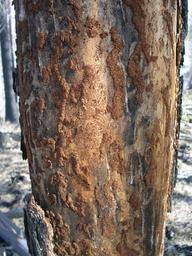 | Keywords: WildFireAreaNHorken0709-Fire&incectsScars.JPG Wild fire area N Hörken Ljusnarsberg Sweden When an area of the stem is severe injured and the bark and some of the sap wood are killed by the fire the tree can not protect itself against the insects attack If enough bark persist on the other side of the tree it may still survive but with reduced increment growth and a big fire scare The surviving sap wood under the scare will fill up with resin and be very resistant towards insects and fungi If so the scares will be easily seen in this tree and in its neighbor trees for many hundred years if they will not be cut down before that Own 2007-09-21 Taxelson 60 2 30 N 14 54 37 E Images by T Axelson Diseases and disorders of Pinus sylvestris Wild fire area at lake Norra Hörken Burnt vegetation Tomicus piniperda |