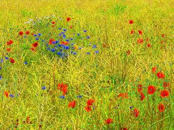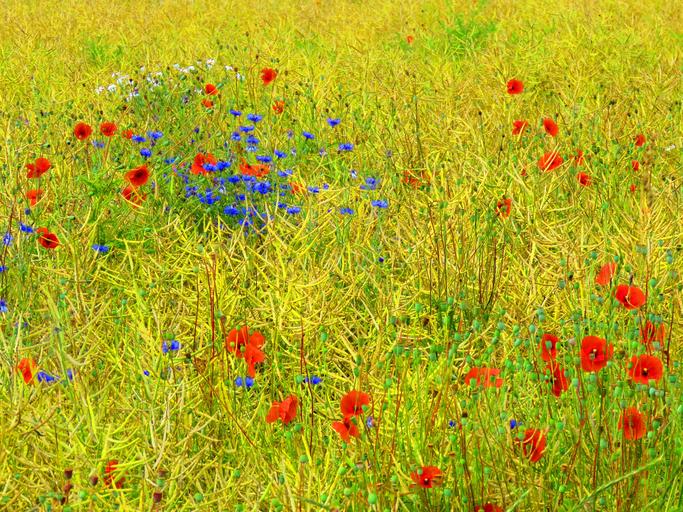 Keywords: wildflowers flower meadow poppy cornflowers red blue colorful nature summer flowers summer meadow grasses blütenmeer