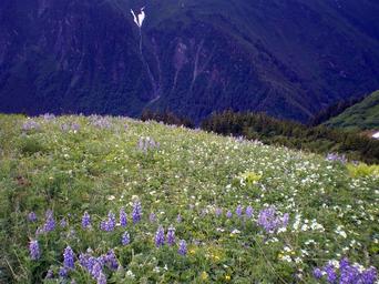 Keywords: wildflowers mountains blue blooms hills hilly hillside landscape valley flowering plants green leaves trees wild outdoors blooming blossoms countryside peaks rocks