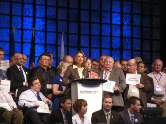 | Keywords: Wildrose AGM 2010.JPG Danielle Smith addressing attendees of the provincial party's 2010 Annual General Meeting on the afternoon of Saturday June 26 in Red Deer Alberta Sitting in front is the party's 4 member caucus from left to right Guy Boutilier Heather Forsyth Paul Hinman and Rob Anderson On the far right wearing a pink shirt is party president Hal Walker The other people on the platform are constituency association presidents from around the province own Brian Dell Bdell555 2010-06-26 Provincial politicians of Alberta Taken with Sanyo Xacti VPC-CS1 Wildrose Alliance Party of Alberta Danielle Smith 2010 in Alberta June 2010 in Canada 2010 in politics of Canada |