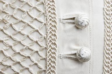 | Keywords: Wilhelmina von Hallwyls bröllopsklänning. Detalj. Knappar - Hallwylska museet - 87240.tif BRUDDRÄKT jämte sexton lösa föremål Bestående av klänning slöja krona krans och bukett näsduk strumpor strumpeband skor linne snörliv kalsonger nattröja nattmössa morgonmössa och tofflor Klänning Liv och kjol samt fyra lösa bandlängder till rosett Av vit sidenmoiré moiré antique med handknuten garnering av gulvitt silke Hand- och maskinsydd Liv Högt bestående av två framstycken två sidostycken och ett ryggstycke alla sneddade Knäppning framtill med kulformiga vita snörmakeriknappar samt knapphål nedanför dessa hakar och hyskor av vit metall isydda med kaststygn under en kantslå av vitt siden Ärmar halvlånga nedre kanten rak Liv och ärmar fodrade med vitt glansigt bomullstyg s k kambrik I sömmarna stöd av valfiskben Kjol Bestående av åtta raka våder baktill ett fållat sprund samt i högra framsömmen en avlång ficka av tyg som livfodret sömmarna maskinsydda Mått Liv längd omkring 41 cm ; bröstvidd omkring 50 cm ; halsvidd omkring 37 cm ; midjevidd omkring 54 cm Ärmar längd omkring 54 cm ; vidd omkring 32 cm Holkar längd omkring 18 cm ; vidd omkring 26 cm Bårder bredd omkring 4 6 5 och 7 cm Tofs längd omkring 5 5 cm Frans längd omkring 3 5 och 8 cm Kjol längd fram omkring 1 16 m ; bak omkring 1 77 m ; vidd omkring 5 48 m Linning längd omkring 64 cm ; bredd omkring 3 cm <br/><br/>Bandlängder <br/>Av vit sidenrips med satinkanter de två korta till öglor de två långa till ändar de senare på vardera ytterändan med garnering som på livet <br/><br/>Mått <br/>Längd 0 41 och 1 36 m ; bredd 18 cm<br/><br/>Anm <br/>Rosetten troligen från en senare modellförändring <br/><br/>Slöja <br/>Av vit silkestyll Rektangulär i två olika stora stycken <br/><br/>Mått <br/>Stora stycket längd omkring 2 32 m ; bredd omkring 1 65 m <br/>Lilla stycket längd omkring 1 68 m ; bredd omkring 1 56 m<br/><br/>Krona <br/>Rund Stommen bestående av åtta radiella byglar av mörk karkas nedtill fästa vid en horisontell liggande ring byglarnas övre ändar sammanlöpande upptill i mitten till en nedåtvänd kort spets samt virade med tätt sittande myrtenkvistar <br/><br/>Krans <br/>Med stomme som kronan samt omvirad med myrtenkvistar <br/><br/>Bukett <br/>Av myrten med rester av vita liljor <br/>Dessutom fragment av en liten bukett bestående av en ros samt gullborste Linosyris vulgaris eller Aster linosyris; användes på 1800-talet och ännu i början av 1900- talet som grönt i buketter o d <br/><br/>Näsduk <br/>Av vit linnebatist med bred vit spets application de Bruxelles <br/>Kvadratisk handsydd <br/>Spetsen knypplad samt sydd på maskinvävd tyll <br/>Spetsen fastsydd med efterstygn av vit tvåtrådig linnetråd vid ett mittstycke av vit linnebatist <br/><br/>Mått <br/>Sidlängd omkring 43 cm <br/><br/>Strumpor ett par <br/>Av vitt silke vävda <br/>På vardera smalbenets utsida en tät rand upptill med axliknande avslutning samt nedtill tvådelad med en lång rand på foten och en kortare på hälen <br/>Upptill en bred fåll på utsidan med två par parallella smala ljusröda ränder <br/><br/>Mått <br/>Längd omkring 79 cm ; vidd omkring 22 5 cm <br/><br/>Strumpeband ett par <br/>Handsydda Av ljust rödgredelint sidentaftband varpå pålagt ett mittparti av vitt sidentaftband med stadkanterna omvikta och fastsydda med fållstygn av ljust rödgredelint silke <br/>Bandens ändar trubbvinkligt urklippta <br/><br/>Mått <br/>Längd omkring 1 m ; mittparti längd 25 cm <br/>Band bredd omkring 2 5 cm <br/><br/>Skor sedermera s k pumps ett par <br/>Av vit sidenatlas <br/>Hand- och vändsydda <br/>På vardera sidan på mitten två snett tvärgående efterstygnssömmar s k sidosömmar av vitt silke <br/>Knytband av vita smala tvåskaftade sidentaftband <br/>Bakstycket fodrat med vitt getskinn framstycket med vitt tvåskaftat linnetyg <br/>Sula av tunt ljusbrunt läder med tvärskuren tå Fodersula av vitt getskinn <br/>Klack av trä halvhög svagt insvängd klädd med vit sidenatlas samt med ytterlapp av ljusbrunt läder fäst med sex stift av mässing <br/><br/>Mått <br/>Längd omkring 24 cm ; bredd omkring 6 2 cm<br/>Klack höjd omkring 3 cm <br/>Knytband längd omkring 52 cm ; bredd 0 8 cm <br/><br/>Linne <br/>Av vitt tvåskaftat linnetyg samt med broderier <br/>Hand- och maskinsytt <br/>Fram- och bakstycke sneddade samt hopsydda med fällsömmar <br/>Ärmhålen starkt sneddade uppåt ärmarna korta med kilar <br/>Halsurringningen svagt rundad samt tätt rynkad <br/>Alla sömmar sydda med fin vit bomullstråd <br/><br/>Mått <br/>Längd omkring 1 07 m ; vidd nedtill 1 8 m <br/>Ärmar längd omkring 7 8 cm ; vidd omkring 36 cm <br/>Halslinning längd omkring 93 cm ; bredd omkring 0 8 cm <br/><br/>Snörliv <br/>Av vitt fyrskaftat bomullstyg och vitt tvåskaftat linnetyg <br/>Handsytt <br/>Två symmetriska sneddade stycken hopsydda framtill i mitten och bildande en lång spets Nedtill på vardera sidan om denna fyra kilar en tresidig och tre fyrsidiga upptill två starkt sneddade tresidiga kilar Mellan kilarna ett stöd av valfiskben utanför bortre kilen sex dylika stöd <br/>Sömmarna sydda dels med vitt silke dels med vit bomullstråd <br/><br/>Mått <br/>Höjd fram omkring 35 5 cm ; bak omkring 35 cm <br/>Midjevidd omkring 46 cm <br/><br/>Kalsonger s k öppna ett par <br/>Av vitt smalrandigt fyrskaftat bomullstyg samt med broderi <br/>Handsydda och handbroderade <br/>Bestående av två fram- och baktill sneddade stycken på framsidan hopsydda ett stycke upptill med fällsöm <br/>Alla sömmar sydda med vit fin bomullstråd <br/>Mått <br/>Längd omkring 84 cm ; linning längd omkring 94 cm <br/>Ben vidd nedtill omkring 56 cm ; band längd omkring 83 cm <br/><br/>Underkjol <br/>Av vitt tvåskaftat bomullstyg samt med broderi <br/>Hand- och maskinsydd <br/>Bestående av fem raka våder upptill tätt rynkad runtomkring samt fastsydd med fållstygn 