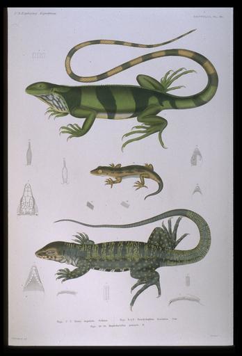 | Keywords: Wilkes expedition Reptilia Plate 18.jpg An image bearing the title US Exploring Expedition REPTILIA PL 18 with the explanation in the caption Figs 1 “7 Teius Teguixin Schinz Figs 8 9 Brachylophus Fasciatus Cuv Figs 10 “16 Hoplodactylus pomarii The caption at the source is Brachylophus Fasciatus Fiji Islands Hoplodactylus pomarii New Zealand and Teius Teguixin which give the order from the top to bottom of the figured reptilian species Charles Girard United States Exploring Expedition During the Years 1838-1842 Under theCommand of Charles Wilkes Herpetology Philadelphia Lippincott 1858 reproduced at http //www lindahall org/events_exhib/exhibit/exhibits/voyages/wilkes shtml Linda Hall Library 1858 Charles Girard Unidentified illustrator PD-old This image was uploaded to supply the source for the extracted File Hoplodactylus pomarii jpg Dactylocnemis pacificus Brachylophus fasciatus Tupinambis teguixin ImageNote 1 47 42 221 39 1071 1577 2 U S Exploring Expedition ImageNoteEnd 1 Charles Frédéric Girard |