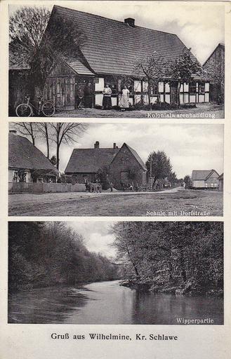 | Keywords: Wilkowice. Wilhelmine (województwo zachodniopomorskie).jpg en Wilkowice before 1945 Wilhelmine Postcard from the early 20th century Postcard shows grocery store;school and village road; river Wieprza Publisher Willy Schröder Photograph Stolp i Pom pl Wilkowice Pocztówka z początku XX wieku sklep kolonialny; szkoła i droga wiejska; rzeka Wieprza Wydawca Willy Schröder Photograph Stolp i Pom de Wilhelmine Kr Schlawe Postkarte aus dem frühen 20 Jahrhundert Kolonialwarenhandlung; Schule mit Dorfstraße; Wipperpartie Verlag Willy Schröder Photograph Stolp i Pom Own collection / Kolekcja własna D N Willy Schröder Early 20th century / Początek XX wieku Wilkowice West Pomeranian Voivodeship PD-old-100 |
