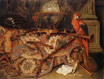 View Original:Willem_Gabron_-_Still_Life_with_Turkish_Carpet_and_a_Parrot.jpg (800x612)