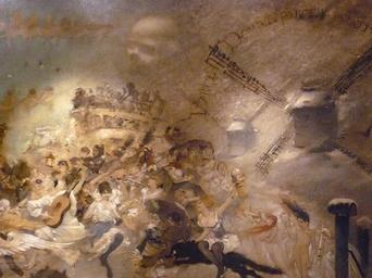 | Keywords: WILLETTE Adolphe,1884 - Parce Domine - Detail 091.jpg - Detail 091 - Une foule en fête et un attelage à imperiale au-dessus des toits de Paris près des moulins - a festive crowd and a double-deck carriage above Paris roofs near the mills and a skull - Montmartre - 1884 Oil on canvas Montmartre Own other versions PD-old-auto 1926 Details of Parce Domine by Adolphe Willette | ||||