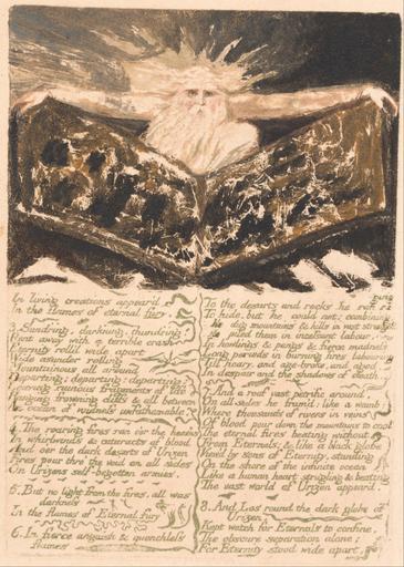 | Keywords: William Blake - The First Book of Urizen, Plate 6, "In living creations appear'd . . . ." (Bentley 5) - Google Art Project.jpg print green watercolor paper cream Color-printed relief etching in green with watercolor on moderately thick slightly textured cream wove paper London 1757 London 1827 William male 2369124 Blake British 1757 - 1827 /collection/yale-center-for-british-art/artwork/the-first-book-of-urizen-plate-6-in-living-creations-appeard-bentley-5-william-blake/2352880/ William Blake Artist /artist/william-blake/4130035/ 4130035 /collection/yale-center-for-british-art/ Yale Center for British Art 2305845 http //britishart yale edu/ 2/23/2012 9 35 35 PM /collection/yale-center-for-british-art/artwork/the-first-book-of-urizen-plate-6-in-living-creations-appeard-bentley-5-william-blake/2352880/ 1794 1794 beard leaf flames men fire text vines historical subject book Color-printed relief etching in green with watercolor on moderately thick slightly textured cream wove paper 149 2352880 False 1794 3/25/2012 5 19 01 PM YCBA/lido-TMS-2351 http //collections britishart yale edu/vufind/Record/1667306 Yale Center for British Art Paul Mellon Collection print 1790 1800 London Creation w105 x h149 cm 1794 False 0 7109375 Volume the-first-book-of-urizen-plate-6-in-living-creations-appeard-bentley-5-william-blake The First Book of Urizen Plate 6 In living creations appear'd Bentley 5 f 105 Inscribed in graphite lower left 7 Inscription _Signed_and_Dated Not signed not dated Not on View Color-printed relief etching in green with watercolor on moderately thick slightly textured cream wove paper beard leaf flames men fire text vines historical subject book special url_id uwEF44loIFGM_Q PD-old-100-1923 1827 The Book of Urizen Google Art Project works by William Blake |