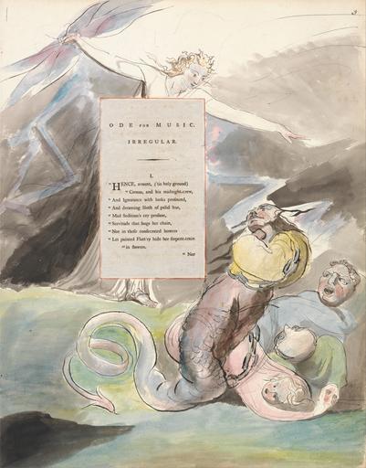 | Keywords: William Blake - The Poems of Thomas Gray, Design 95, "Ode for Music." - Google Art Project.jpg watercolor pen ink black graphite paper cream Watercolor with pen and black ink and graphite on moderately thick moderately textured cream wove paper London 1757 London 1827 William male 2369124 Blake British 1757 - 1827 /collection/yale-center-for-british-art/artwork/the-poems-of-thomas-gray-design-95-ode-for-music-william-blake/2377582/ William Blake Artist /artist/william-blake/4130035/ 4130035 /collection/yale-center-for-british-art/ Yale Center for British Art 2305845 http //britishart yale edu/ 2/23/2012 9 51 00 PM /collection/yale-center-for-british-art/artwork/the-poems-of-thomas-gray-design-95-ode-for-music-william-blake/2377582/ 1797 between 1797 and 1798 creature clouds angel sky serpent bodies stars lightning men scales chains text sea flowers vines garden chair lyre historical subject Watercolor with pen and black ink and graphite on moderately thick slightly textured cream wove paper with inlaid letterpress page 419 2377582 False 1798 3/24/2012 3 42 30 PM YCBA/lido-TMS-3689 http //collections britishart yale edu/vufind/Record/1667940 Yale Center for British Art Paul Mellon Collection painting 1790 1800 Felpham Creation w324 x h419 cm between 1797 and 1798 False 0 783203125 Volume the-poems-of-thomas-gray-design-95-ode-for-music-william-blake The Poems of Thomas Gray Design 95 Ode for Music p 324 Inscribed in black ink upper right 3 ; in graphite center X ; on verso in black ink upper left 4 ; in graphite center + Inscription _Signed_and_Dated Not signed not dated Not on View Watercolor with pen and black ink and graphite on moderately thick slightly textured cream wove paper with inlaid letterpress page creature clouds angel sky serpent bodies stars lightning men scales chains text sea flowers vines garden chair lyre historical subject special url_id 7wG1RhT5kuvz6A PD-old-100-1923 1827 Google Art Project works by William Blake William Blake's illustrations to Thomas Gray's Poems 095 |