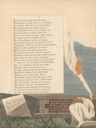 | Keywords: William Blake - Young's Night Thoughts, Page 55, "Ungrateful, Shall We Grieve Their Hovering Shades" - Google Art Project.jpg Google Art Project watercolor London 1757 London 1827 William male 2369124 Blake British 1757 - 1827 /collection/yale-center-for-british-art/artwork/youngs-night-thoughts-page-55-ungrateful-shall-we-grieve-their-hovering-shades-william-blake/2389256/ William Blake Artist /artist/william-blake/4130035/ 4130035 /collection/yale-center-for-british-art/ Yale Center for British Art 2305845 http //britishart yale edu/ 2/23/2012 9 48 54 PM /collection/yale-center-for-british-art/artwork/youngs-night-thoughts-page-55-ungrateful-shall-we-grieve-their-hovering-shades-william-blake/2389256/ 1797 1797 angel pointing women thorns grass text grave flowers plants vines tombstone gravestone gravestone historical subject mourning Etching and line engraving with watercolor on moderately thick slightly textured cream wove paper 445 2389256 False 1797 3/25/2012 9 15 07 PM YCBA/lido-TMS-3556 http //collections britishart yale edu/vufind/Record/1667849 Yale Center for British Art Paul Mellon Collection painting 1790 1800 Felpham Creation w330 x h445 cm 1797 False 0 751953125 Volume youngs-night-thoughts-page-55-ungrateful-shall-we-grieve-their-hovering-shades-william-blake Young's Night Thoughts Page 55 Ungrateful Shall We Grieve Their Hovering Shades y 330 No inscription Inscription _Signed_and_Dated Not signed not dated Not on View Etching and line engraving with watercolor on moderately thick slightly textured cream wove paper angel pointing women thorns grass text grave flowers plants vines tombstone gravestone gravestone historical subject mourning special url_id NwHZwB4ieKB_NQ PD-old-100-1923 1827 William Blake's illustrations to Young's Night Thoughts 055 Google Art Project works by William Blake |