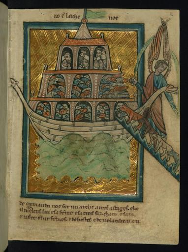 | Keywords: William de Brailes - The Animals Enter Noah's Ark (Genesis 6 -13-7 -16) - Walters W1062R - Full Page.jpg Walters Art Museum artwork Creator William de Brailes This page from Walters manuscript W 106 depicts a scene from the story of Noah's ark God commanded Noah to build an ark of gopher wood with a roof and three decks Into the ark Noah brought two of every animal make and female On the lower deck are the animals on the middle the birds and on the upper deck Noah and his family The last birds are flying into the ark and the last animals are being escorted by an angel The flood has already started and the ark with its beast-headed prow and stern floats upon its waters pennant flying ca 1250 Medieval ink pigment parchment cm 13 2 9 5 accession number W 106 2R 8948 Léon Gruel Paris date and mode of acquisition unknown Henry Walters Baltimore June 6 1903 by purchase see The Diaries of George Lucas Walters Art Museum Henry Walters Acquired by Henry Walters 1903 Transliteration Above the image ceo est l'arche noe; Transliteration Below the image de cumanda noe fer un arche a tres astages e ke il meist lens lui e sa femme e sa treis fiz cham e sam e iafet e lur femmes e de bestes e de volatilie ii e ii ; Translation Below the image God commanded that Noah make a three-leveled ark and that he put in it himself and his wife and their three sons Cham Sam and Iafet and their wives and pairs of beasts and birds place of origin Oxford England United Kingdom Walters Art Museum license 2D Walters MS W106 - Bible Pictures by William de Brailes Media contributed by the Walters Art Museum needs category review Noah's Ark in miniatures |