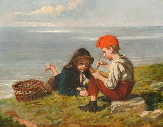 | Keywords: William Hemsley The young boat builders.jpg The young boat builders Signed W Hemsley Oil on canvas 21 5 x 28 cm http //www bonhams com/ Bonhams by 1893 Creator William Hemsley PD-old-100 Images from Bonhams William Hemsley Toy boats in art People at the beach in art Paintings of boys sitting on the ground outdoors |