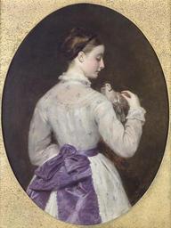 | Keywords: William Powell Frith The two doves 1869.jpg The two doves Signed and dated WPFrith 1869 Inscribed on various exhibition labels attached to the reverse Oil on canvas oval 58 5 x 44 5 cm http //www bonhams com/ Bonhams 1869 Creator William Powell Frith PD-old-100 Images from Bonhams William Powell Frith Pigeons in art Paintings of women with birds 1869 paintings Female human backs in art Art with brown background Three-quarter views of females Female hands in art | ||||