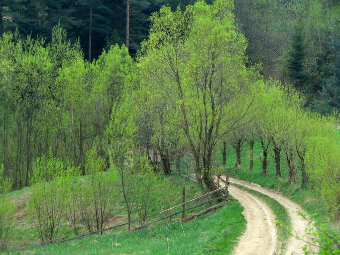 Keywords: willow way country road spring green tree mountains beskids nature poland