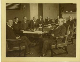 | Keywords: white house whitehouse cabinet president wilson monochrome indoor Local Accession Number: 2001 Description: Left to Right: Woodrow Wilson, W.G. McAdoo, J.C. McReynolds, J. Daniels, D.F. Houston, W.B. Wilson, W.C. Rodfield, F.K. Lane, A.S. Burleson, L.M. Garrison, W.J. Bryan Photographer: Unknown Source: Donated by Dr. and Mrs. John Isenhath Size: 10x8 Medium: Print, Sepia Date: 1913 Local Accession Number: 2001 Description: Left to Right: Woodrow Wilson, W.G. McAdoo, J.C. McReynolds, J. Daniels, D.F. Houston, W.B. Wilson, W.C. Rodfield, F.K. Lane, A.S. Burleson, L.M. Garrison, W.J. Bryan Photographer: Unknown Source: Donated by Dr. and Mrs. John Isenhath Size: 10x8 Medium: Print, Sepia Date: 1913 |
