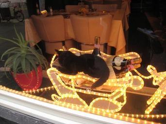 Keywords: WinCat1.JPG en Pic taken in Amsterdam of a cat resting behind shop window own Jamesjiao 2008-12 Solid black cats Cats of the Netherlands Cats at windows Christmas decorations Sleighs
