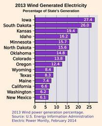 | Keywords: Wind Generation Percentage Bar Chart U.S. 2013.svg en Bar chart of percentage of electricity generation by wind power for leading states 2014-04-01 15 16 26 own Aflafla1 Valid SVG Created with Python cc-zero Uploaded with UploadWizard Wind energy statistics of the United States |