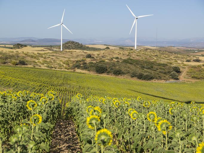 Keywords: wind park wind energy renewable mill power generation windmill wind wind turbine windmills sunflowers field sunflower fields sunflower yellow flower sunflower oil sky nature