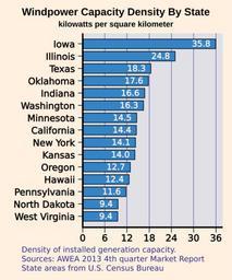 | Keywords: Wind power capacity density by state 2013.svg en Bar chart showing wind power capacity per area for leading states for 2013 2014-04-01 18 18 32 own Aflafla1 Valid SVG Created with Python cc-zero Uploaded with UploadWizard Wind energy statistics of the United States |