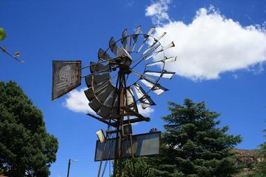 Keywords: windmill blue sky clouds trees outside energy power wind rural technology propeller turbine