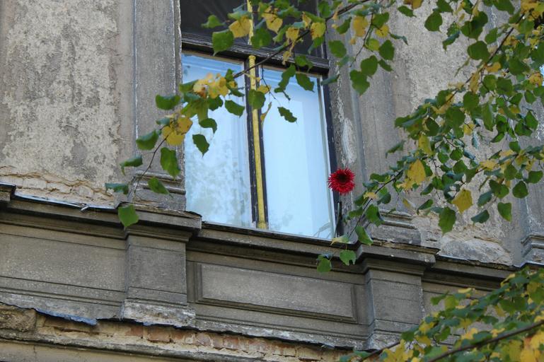 | Keywords: window old window home facade building architecture old ruined house atmosphere wild decay dilapidated lapsed old house still life window sill flower flower vase deciduous tree still berlin prenzlauerberg friable masonry break up injury broken run down hauswand |