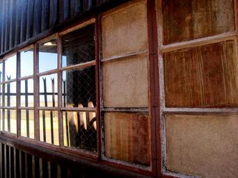 Keywords: window row of windows opaque panes clear reflecting panes light corrugated iron shed