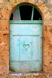 Keywords: window shutter heart home house architecture building facade house window decoration old wooden europe rustic wood country exterior village rural outdoor weathered turquoise brick france fr languedoc