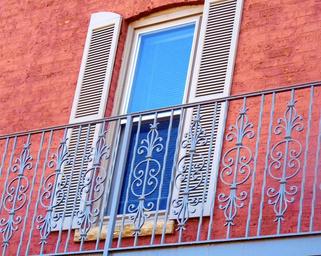Keywords: window shutters balcony blue red facade railing old town illinois building decor