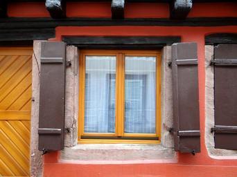 Keywords: window shutters mirroring truss picturesque individual red yellow brown fachwerkhaus old town historically home alsace colmar france