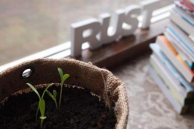 Keywords: window sill plants grow jute books letters potting soil