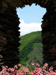 Keywords: window stone stone window by looking sky clouds burg metternich castle ruin metternich vineyards beilstein sachsen germany
