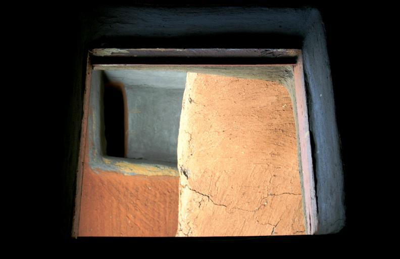 Keywords: window to outside door next to window to outside terracotta grey angles corners rectangles and squares light and shadow