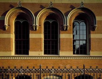 Keywords: windows architecture detail design brick exterior building glass arches wrought iron fence urban