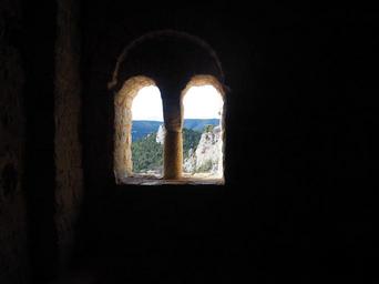 Keywords: windows castle outside looking out view interior old architecture stone historic building ancient arch column structure darkness light contrast