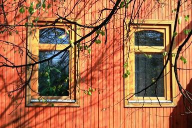 Keywords: windows two glass panes reflection building wood rust-red spring branch
