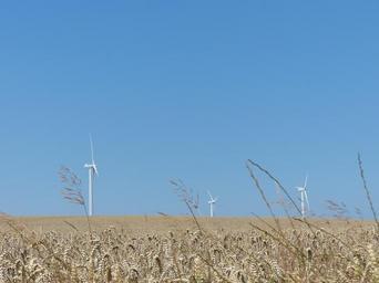 Keywords: windräder wind park wind power wind energy summer field cereals sky