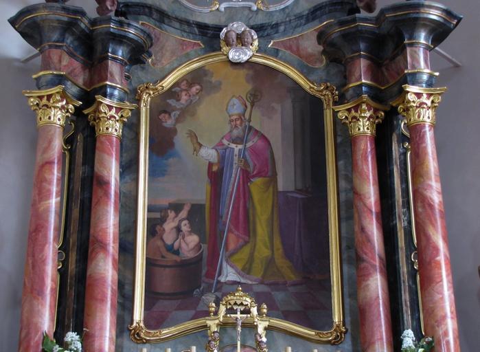 Keywords: Wingersheim StNicolas 16.JPG Alsace Bas-Rhin Wingersheim Eglise Saint-Nicolas Maître-autel-tabernacle avec tableau Saint-Nicolas ressuscitant trois enfants XIXe own 2012 Ralph Hammann Cc-zero Artwork / Œuvre d'art / Kunstwerk Artist Saint Nicolas en costume d'évêque bénit les trois enfants assis dans le saloir ; au sol une bourse sur une table en arrière-plan un livre sur lequel sont posées trois petites bourses XIXe siècle oil canvas cm Eglise Saint-Nicolas Wingersheim IM67013164 object history other versions Ralph Hammann PD-old accession number Autel principal Église Saint-Nicolas de Wingersheim Photographs of Wingersheim by Ralph Hammann Taken with Canon PowerShot SX20 IS Objets monuments historiques in Bas-Rhin church paintings Baroque church paintings in Alsace 18th-century church paintings in Alsace Paintings of Saint Nicholas Paintings of putti in France 18th-century paintings of putti Saint Nicholas and the three children |