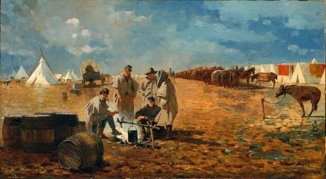 | Keywords: Winslow Homer - Rainy Day in Camp.jpg Artwork Creator Winslow Homer 1871 oil on canvas cm 50 8 91 4 Metropolitan Museum of Art Gallery 762 accession number 23 77 1 object history William F Milton New York and Pittsfield Massachusetts 1871 “died 1905; his wife 1905 “1923 credit line Gift of Mrs William F Milton 1923 Signature at lower right over two former signatures WINSLOW HOMER / 1871; at left on barrel HOMER http //www metmuseum org/Collections/search-the-collections/20011491 The Metropolitan Museum of Art A Rainy Day in Camp by Winslow Homer 1871 jpeg PD-old-100-1923 1910 Oil paintings by Winslow Homer 1870s paintings by Winslow Homer Paintings by Winslow Homer in the Metropolitan Museum of Art Paintings of the American Civil War 1871 paintings |