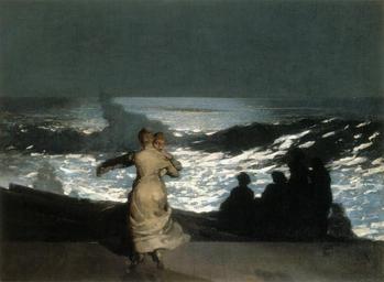 | Keywords: Winslow Homer - Summer Night (1890).jpg Artwork Q17494534 Creator Winslow Homer 1890 oil canvas cm 76 7 102 institution Musée d'Orsay 000PE021223 http //www musee-orsay fr/index php id 851 L 1 tx_commentaire_pi1 5BshowUid 5D 455 no_cache 1 Musée d'Orsay online object history Date acquisition 1900 credit line Homer 1890 ~ lower left signature and date This nocturnal scene by the sea transcends observed reality through a keen sense of poetry and mystery The light and shade effects blur shapes while the ghostly silhouettes of two women dance on the shore Although it may well have been influenced by Courbet's Waves the lyricism tinged with mysticism expressed by Homer helped develop a feeling for nature that is peculiarly American accession number RF 1977 427 1 source <br/>2 8556 PD-old-100-1923 DEFAULTSORT Homer Summer night 1890; Musée d'Orsay Oil paintings by Winslow Homer 1890s paintings by Winslow Homer 1890 Summer night Musée d'Orsay Paintings in Musée d'Orsay Paintings of dancing couples 1890 oil on canvas paintings in France |