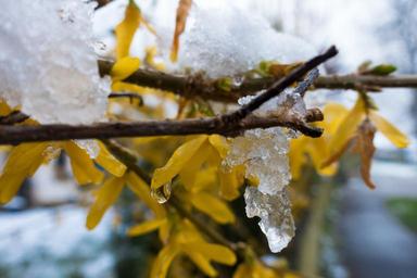 Keywords: winter blast snow melt drip frost forsythia garden forsythia gold lilac golden bells blossom bloom forsythienblüte flower spring lenz garden plant yellow april april weather