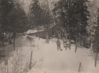 | Keywords: buildings winter sports wintersports outdoor monochrome Photographer: Reuben R. Sallows (1855 - 1937) Description: Log cabin situated on hill surrounded by trees; man standing short distance from cabin on slope of hill facing right; man is wearing snowshoes and light coloured coat and pants; dark coloured hat and gloves; there is a path that appears to have been made by the man using snowshoes; date (1917/19) written in pencil and Sallows stamp in purple ink on back Object ID : 0435-rrs-ogohc-ph View additional photographs by Sallows that are held in other collections at the Reuben R. Sallows Digital Library. Order a higher-quality version of this item by contacting the Huron County Museum (fee applies). Photographer: Reuben R. Sallows (1855 - 1937) Description: Log cabin situated on hill surrounded by trees; man standing short distance from cabin on slope of hill facing right; man is wearing snowshoes and light coloured coat and pants; dark coloured hat and gloves; there is a path that appears to have been made by the man using snowshoes; date (1917/19) written in pencil and Sallows stamp in purple ink on back Object ID : 0435-rrs-ogohc-ph View additional photographs by Sallows that are held in other collections at the Reuben R. Sallows Digital Library. Order a higher-quality version of this item by contacting the Huron County Museum (fee applies). |