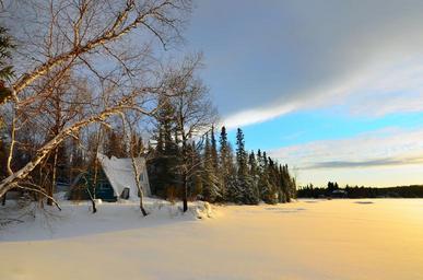 Keywords: winter landscape trees birch snow ice frozen lake nature house clouds