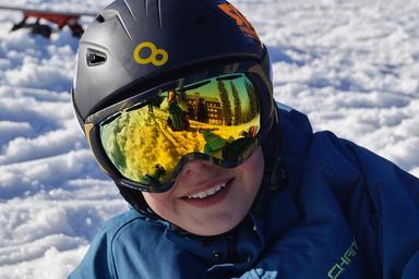 Keywords: winter mountains snow glasses reflection ski goggles helmet smile boy