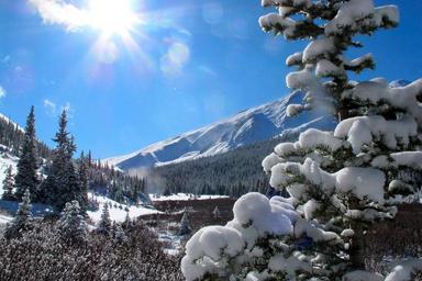 Keywords: winter mountains snow view morning sun trees wintry mountain