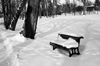 Keywords: winter park white snowy benches frosty bright day sunny sunlight shadows black and white woods trees outdoors seasons cold weather frozen freezing