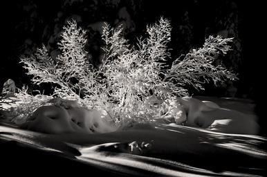 Keywords: winter scene snow bushes landscape scenic black and white cold trees light shadows tranquil wilderness