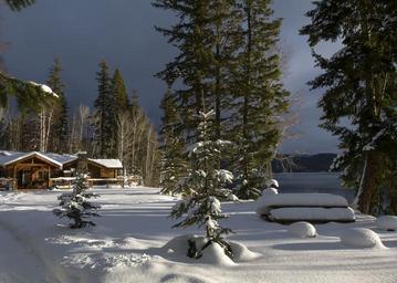 Keywords: winter scenery canim lake british columbia canada snow weather mood sunny day cold landscape trees wintry winter dream snow magic frosty icy outside scenic lake log home building
